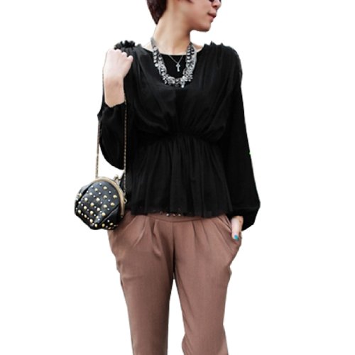 Allegra K Woman Solid Long Sleeve Ruffled Tulle Elastic Waist Blouse Black XS