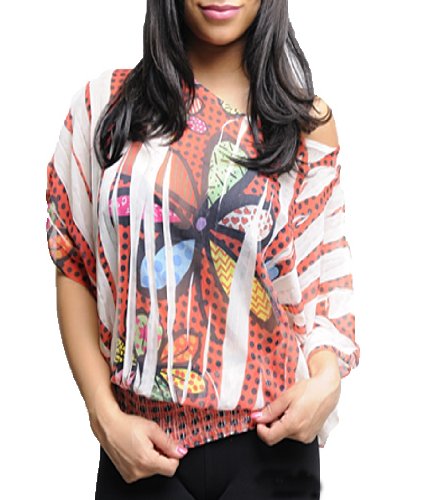 Sheer distressed looking floral print top has wide open sleeves and an elastic hem. Best worn with layering piece beneath. Layering piece not included. Material: 100% polyester. Origin: Made in USA. Cleaning:Hand Wash. Fit Guide:Size 1x measures: 42" bust.