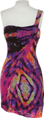 Rampage dress is constructed of a stretch mesh fabrication with a multicolor print. The bodice is ruched along a diagonal panel on the bodice. The bust is padded and inset with counter slip elastic. Bottom of the dress is finished with a bubble hem. Measures approximately 38" long from shoulder to hem.
